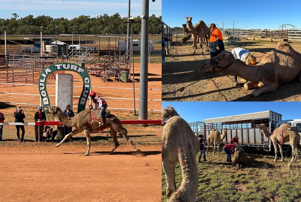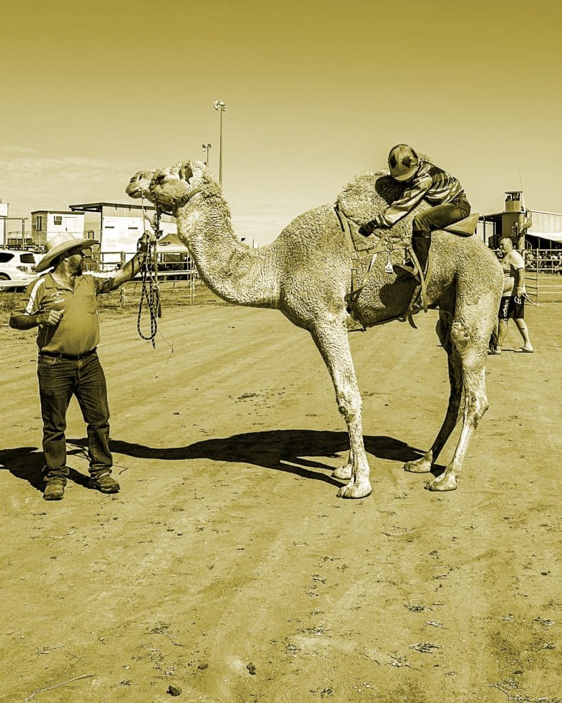 A wire fence separated punters from the trainers, handlers and riders with whom we’d spend the next two nights. They call themselves “camel people,” and don’t like to take themselves seriously. Most encountered camels as unintentionally as McHugh had, and they are Mr Hydes to the jeroboam-popping Dr Jekylls of élite horse-racing—“proud misfits,” as one rider described them to me. Few employ the tactics of a Melbourne Cup-winning team, perhaps this is why Boulia’s bookies stick to a simple maxim: “A slow camel’s a slow camel,” one told me. “A fast one’s a fast one.” The riders were similarly sanguine. Camels “have quite a temperament,” said Chontelle Jannesse, who was competing in her ninth tournament. “They sense fear, and they sense people that are a bit dodgy.” Brettlyn Neal, who, in keeping with the misfit image, had been persuaded to ride her first camel having boxed a jockey in a circus tent, told me that “you hope you get a good start. And you hold on.”