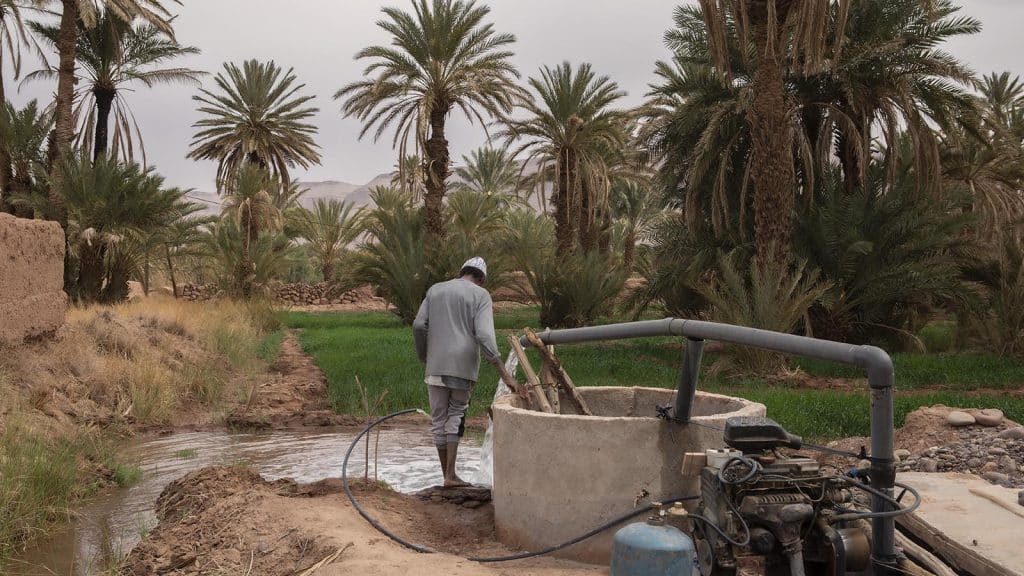 A farmer pumps water from a well in order to water his field in the village of Zouia de Sidi Elmokhtar Ben Ali. In the past, water resources in the oases used to be strictly regulated, with farmers being allotted a specific quantity of water, or irrigation time, on a rotation basis, according to the size of their land. But nowadays the availability of water pumps have prompted some families to dig private wells to irrigate their parcels, further exhausting the groundwater and chipping away at the principle of collective water usage, one of the main social pillars of any oasis.
