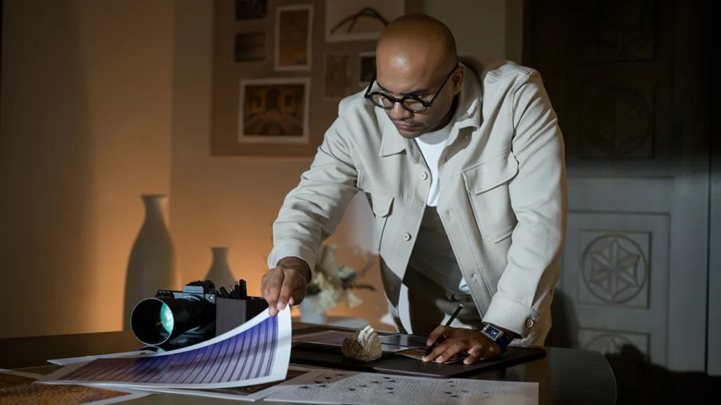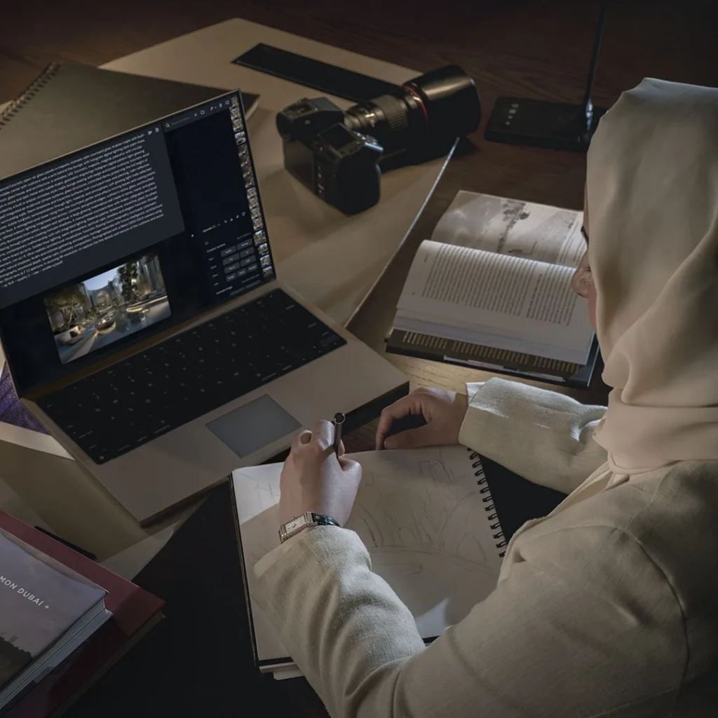 For AlMoosawi, the work starts with the real world. With over 20 years of experience, he acts as the project’s anchor, grounding the art in reality. His camera captures the true look of the region, focusing on traditional details like arches and patterns that define the local architecture.