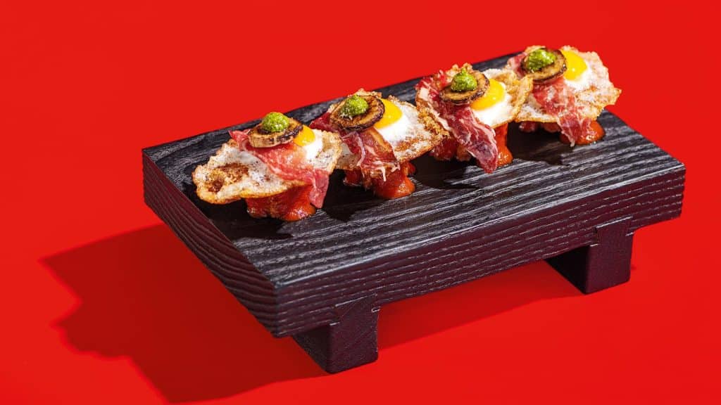 A spin on popular Cuban rice-based street food, this dish is rich in popular culture and delivers a sensory explosion of texture and flavour. I use crispy rice cake with tomato chutney sauce, and then build up the flavour profile with yuzu pesto, fried egg and koji beef ham.