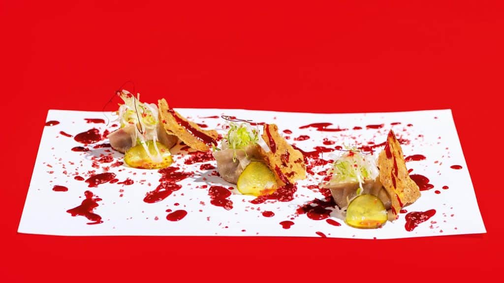 Named after my wife [Spanish TV presenter Cristina Pedroche] this is a unique take on traditional Spanish croquettes. I experimented with more than 100 different types of ingredients before settling on this combination! While you’ll find croquetas on any Spanish menu, these Kimchi croquettes with tuna sashimi are inspired by nigiri with a very powerful and almost liquid-like texture. They look traditional, but are certainly not in flavour!
