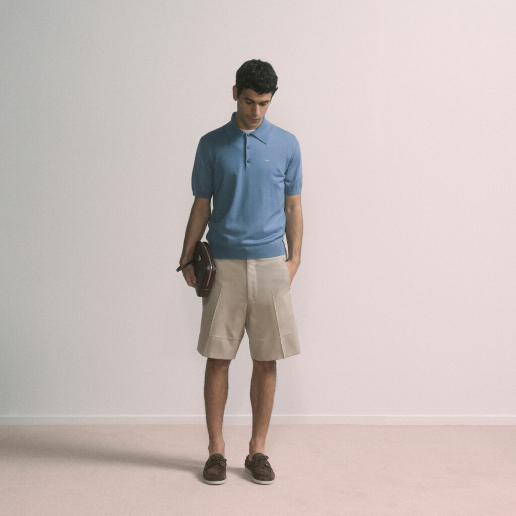 This season, the silhouettes are clean and relaxed. Leather blousons sit neatly over tailored trousers or bermudas, while cashmere and merino polos layer effortlessly under lightweight jackets. Zippered shirts in subtle prints bring a hint of modernity, just enough to keep things interesting without ever feeling overdone. Fabrics catch the light in a soft, festive way, so your outfit can quietly mark the occasion.