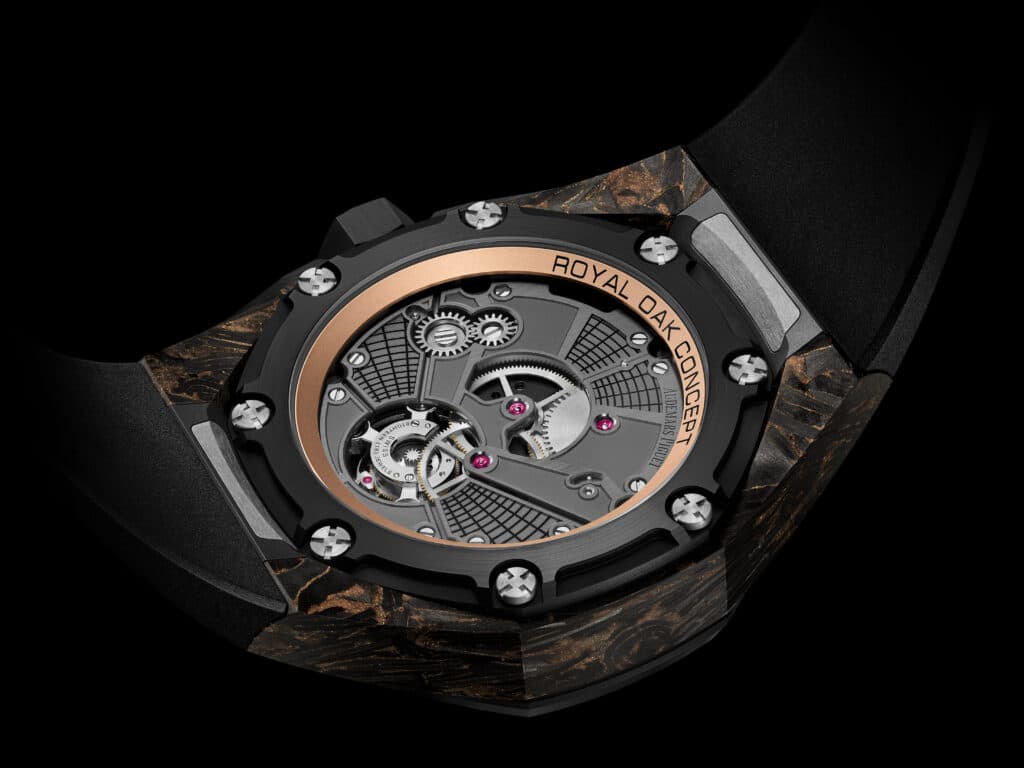 The story continues on the reverse side, where the black ceramic caseback frame meets a pink-gold inner bezel, engraved with Royal Oak Concept. A sapphire crystal caseback offers a view into the movement’s laser-etched finishing, a meticulous display of craftsmanship that aligns with the avant-garde spirit of the timepiece. Every detail, from the polished bridges to the refined cut of the gears, has been carefully curated to captivate those who appreciate the artistry behind watchmaking.